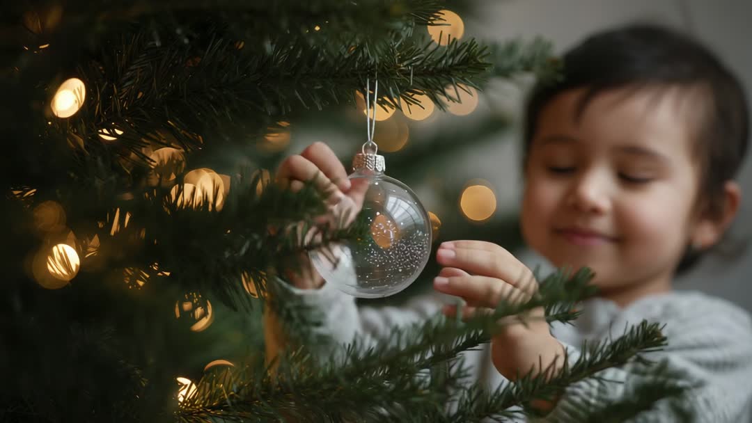 AI Generated Image. Video clip featuring child placing clear glass bauble on Christmas tree branch with warm bokeh lights glowing in background. Composition focusing on hands and ornament while soft focus on smiling face creates intimate, nostalgic mood. Works well for holiday ads, social media reels, greeting cards, blog headers, TV commercials, product demos for ornaments, family lifestyle content and seasonal campaigns. Provides copy space on left for headline or logo and suits slow motion or loopable clip use. Color palette offering warm golden highlights and deep green tones, ideal for creating cozy, homey holiday visuals.