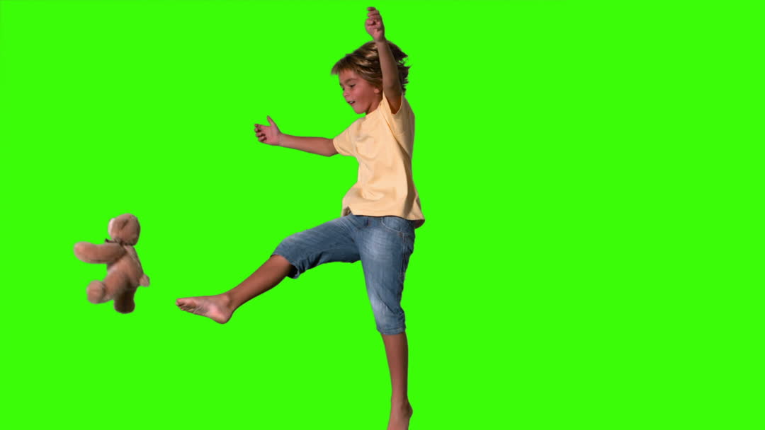 - Child Playfully Kicking Stuffed Bear with Green Screen Background