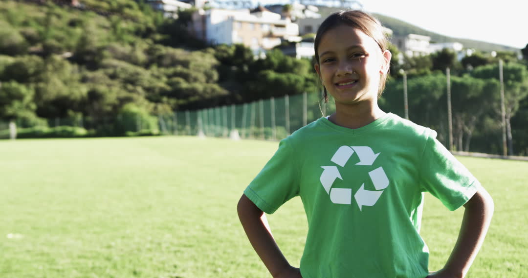 Girl standing in open green area wearing t-shirt with recycle symbol, promoting environmental awareness and sustainability. Ideal for educational and environmental consciousness materials, eco-friendly campaigns, and community outreach projects.