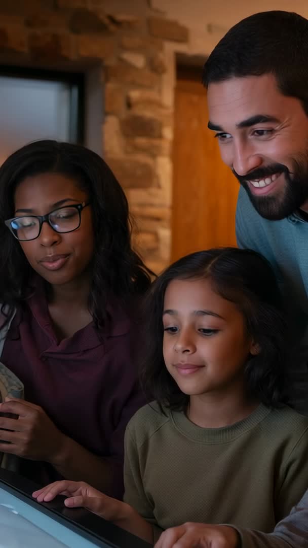 AI Generated Video. Showing child tapping glowing tabletop touchscreen while mom watching and dad smiling. Featuring warm ambient light and close-up framing that highlights focus, curiosity, and family bonding. Ideal for vertical video use in edtech promos, app demo reels, social media stories, smart home marketing, and family lifestyle campaigns. Suggest using as hero clip for interactive learning platform, tutorial for multitouch features, promotional spot for family-friendly tech, or background for article about parenting and screen-based learning. Mood conveying trust, engagement, and playful exploration. Composition working well for mobile-first delivery, short-form video ads, and portrait-oriented storytelling with room for overlay text and captions.