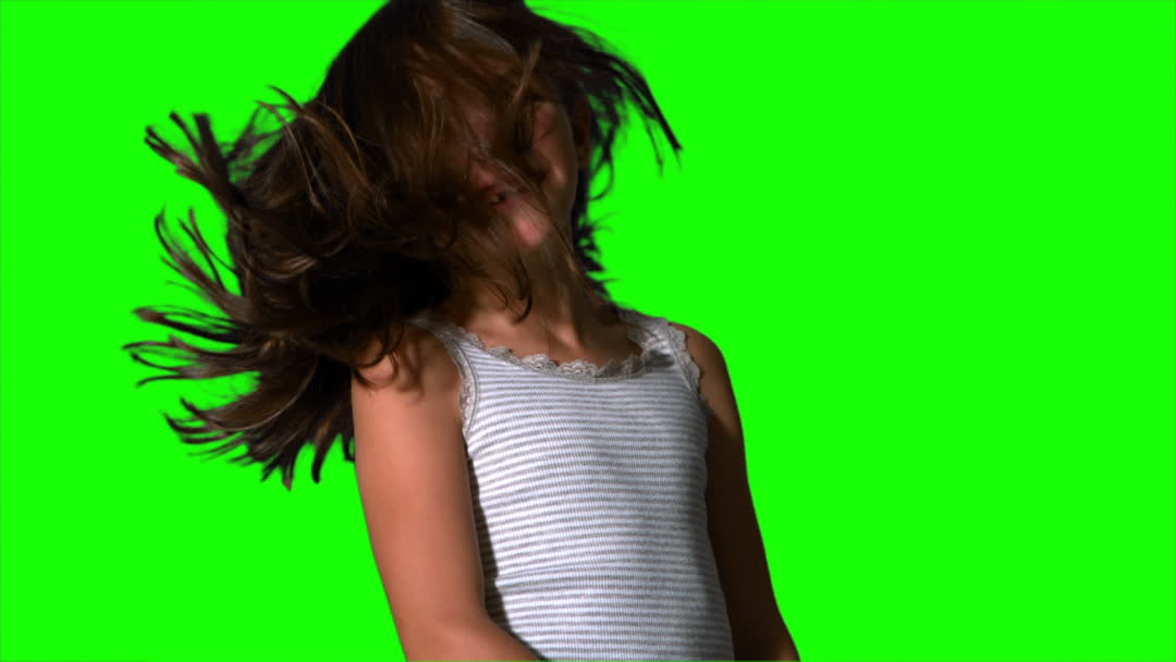 A young girl tossing her hair on a vibrant green screen background, capturing momentary movement with flair. Perfect for editing purposes in video projects, commercials featuring playful energy, or demonstrating hair-related products in promotions aimed at vibrant, carefree childhood themes.