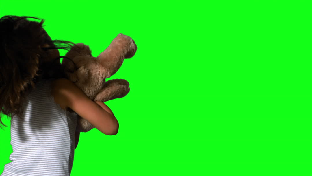 Child enjoying playful moment while embracing teddy bear against vibrant green screen background. Useful for creative projects, advertisements focused on childhood joy, or any design requiring isolated subjects against chroma key backdrops.