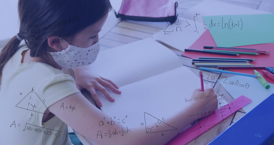- Child Wearing Mask Writing Amidst Floating Math Equations