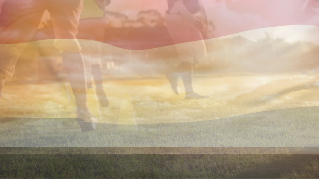 An artistic video showing children and football players running on a field with the United States flag superimposed. This symbolizes national pride and the spirit of sportsmanship. It is ideal for use in patriotic campaigns, promotions related to sports events, school activities highlighting physical education, or community programs celebrating diverse cultures and unity.