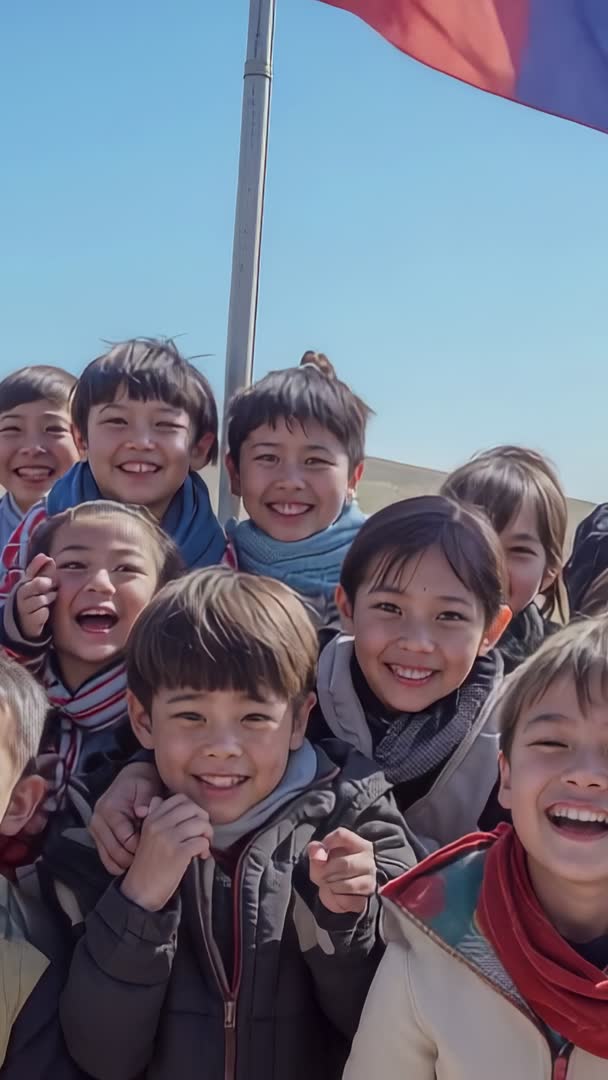 AI Generated Video. Vertical video showing group of children smiling, laughing and posing at base of flagpole on windy hill under clear blue sky. Children wearing jackets and scarves while flags waving in background, natural sunlight illuminating joyful faces. Tight vertical composition optimized for mobile viewing and social platforms. Footage conveying energy, camaraderie and outdoor adventure, suitable for family-oriented marketing, school promotion, travel campaigns, community outreach and charity fundraising. Ideal for use as hero clip for mobile web banners, social media reels, TV spots, documentary B-roll and educational content. Color palette featuring bright blue sky, warm skin tones and colorful scarves, useful for seasonal winter or early spring campaigns. Editing suggestions: adding upbeat music, applying gentle stabilization and using slow push-in for emotional impact.