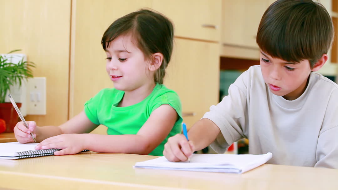 Two children are focused on completing their homework while seated in a kitchen environment. They are writing in notebooks with concentration and determination. This scene illustrates common everyday learning and study habits, providing useful videory related to education, childhood development, and family life. Great for showcasing themes such as schooling, study routines, and educational practices at home.