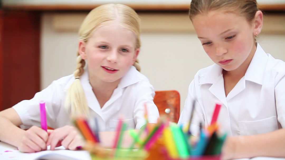 Two young girls enthusiastically illustrates using colorful markers during an art session in class. Ideal for educational content, illustrating children's focus and creativity at school, supporting discussions on art integration in education.