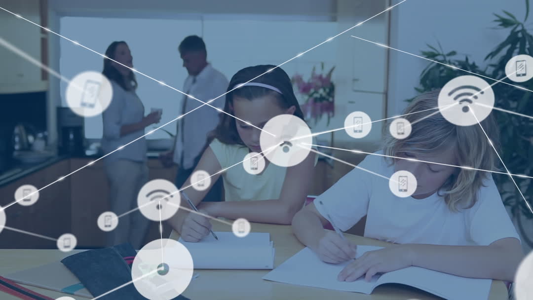 Two children focus on completing their homework with an overlay of digital network icons indicating their connection with technology. This illustrates the integration of modern digital tools in education at home and portrays a futuristic blend of learning and connectivity. Useful for articles, presentations on technology in education, and promotions related to digital learning tools.
