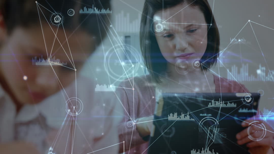This video shows two children deeply focused on using digital devices, with futuristic overlays of network connections highlight the integration of technology in education. Perfect for illustrating articles or presentations on modern educational techniques, digital innovations in schools, or the impact of technology on learning processes.