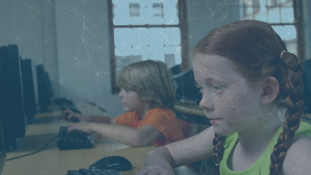 Young students developing computer skills with network graphics overlay suggests focus on connectivity and digital education. Useful for illustrating educational technology advancements, promoting modern learning environments, or representing the integration of computers in schools.