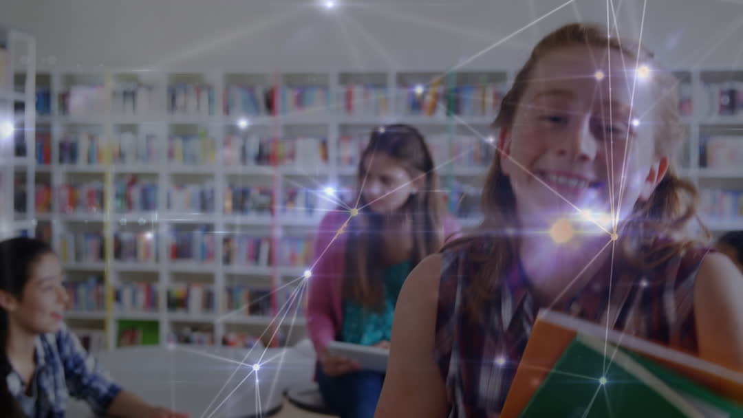 Schoolchildren are studying together in a library filled with books, overlaid by animated digital network lines symbolizing global connectivity and digital learning enhancement. Ideal for illustrating concepts in modern education, digital engagement, or library technology.