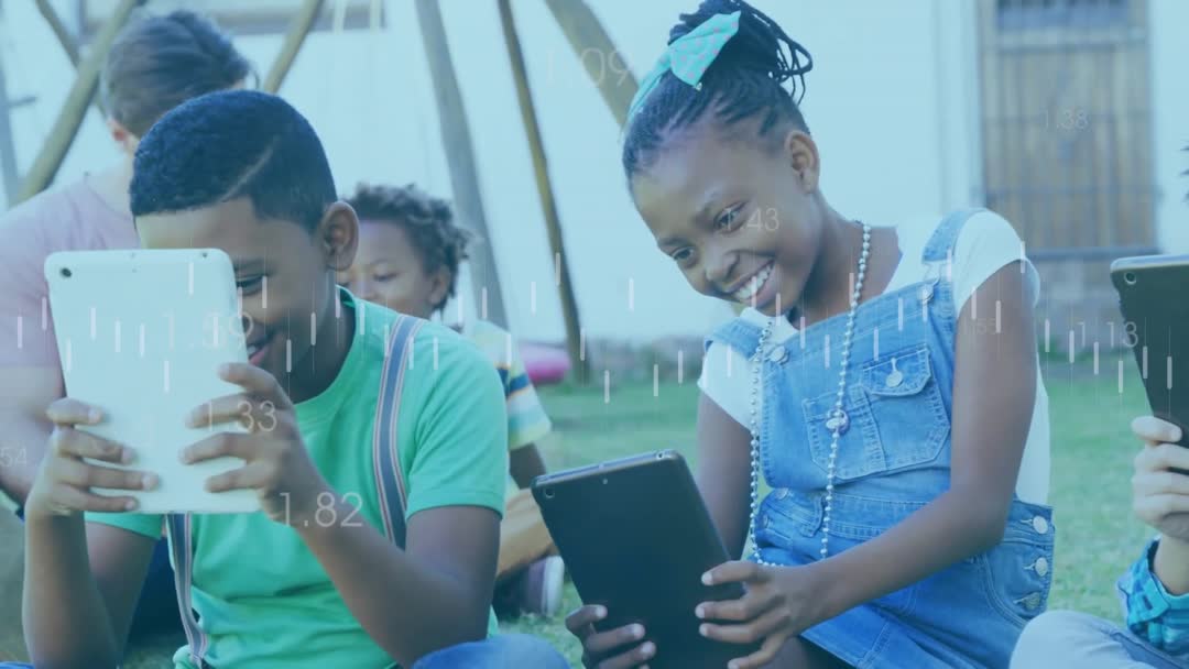 The video shows children sitting on grass using tablets. An animated waveform represents educational data interaction. This visual can illustrate how technology enhances outdoor learning and collaboration among young students, valuable for projects on educational innovation.