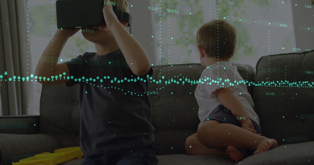 Visual of two children interacting with technology highlights blend of virtual reality and data analysis concepts. Suitable for promoting educational technology, illustrating the intersection of youth and digital advancements, or showcasing interactive visuals in modern analytics presentations.