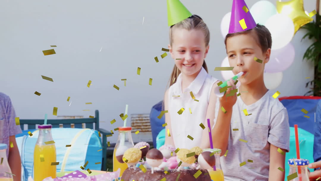 Two children celebrate a birthday with cake and drinks, surrounded by colorful confetti and wearing party hats. Ideal for marketing birthday party supplies, illustrating articles or blog posts about children's parties, and use in family-related content emphasizing celebration and joy.