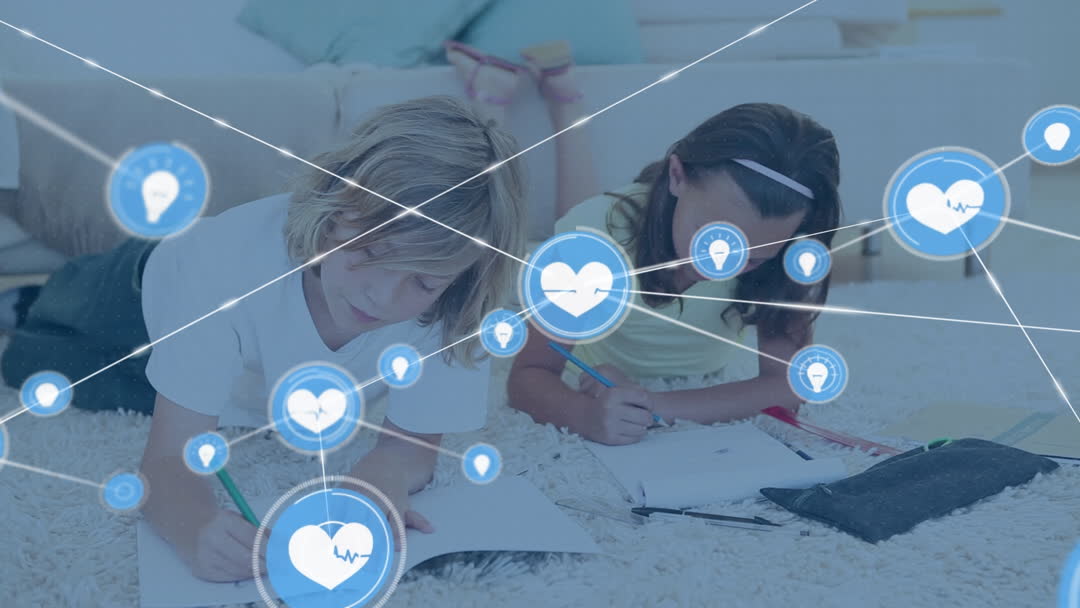 Two young children are surrounded by interconnected digital icons symbolizing ideas and health, suggesting a modern approach to education. This can be used to illustrate topics on educational technology, online learning, or the impact of digital tools in teaching. It highlights the integration of digital innovations in the classroom.