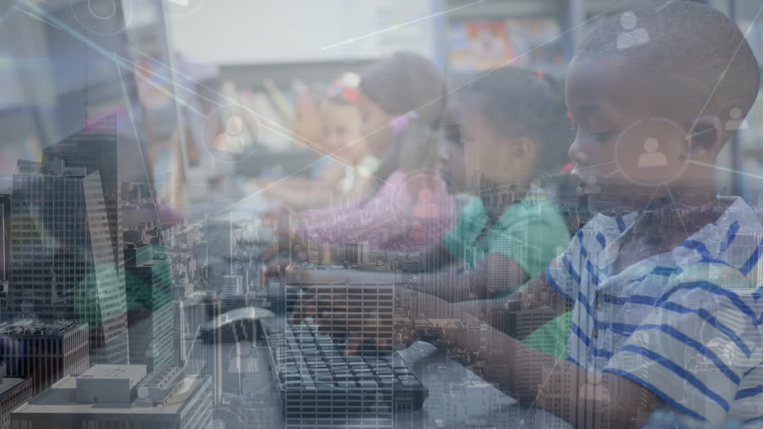Young children eagerly explore modern technology in a classroom setting, featured with an overlay of cityscape and network connections illustrating digital integration. This visual symbolizes the future of education and urban technology careers. Ideal for content related to educational advancements, STEM learning, and youth technology engagement.