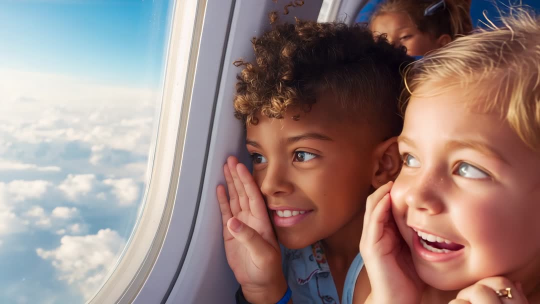 - Children gazing out airplane window at clouds during daytime flight, joyful discovery