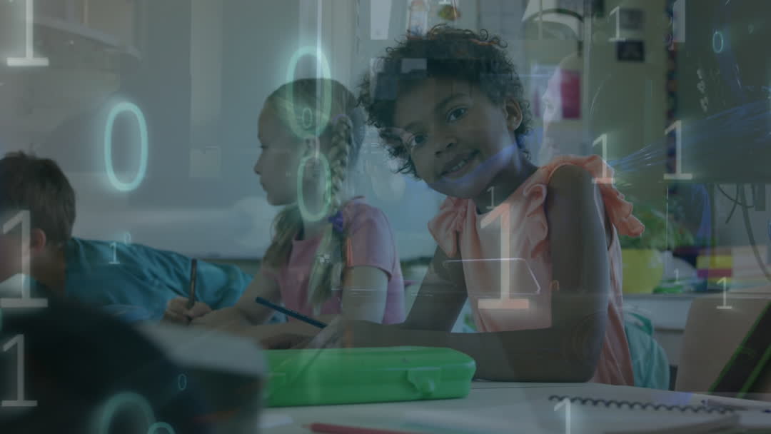 Children are sitting in a classroom engaging with traditional learning materials while a digital overlay of binary code suggests interaction with modern technology. This visual highlights the blend of conventional education with digital advancements, ideal for content promoting futuristic educational technologies, coding basic education for kids, or the integration of digital interfaces in learning environments.