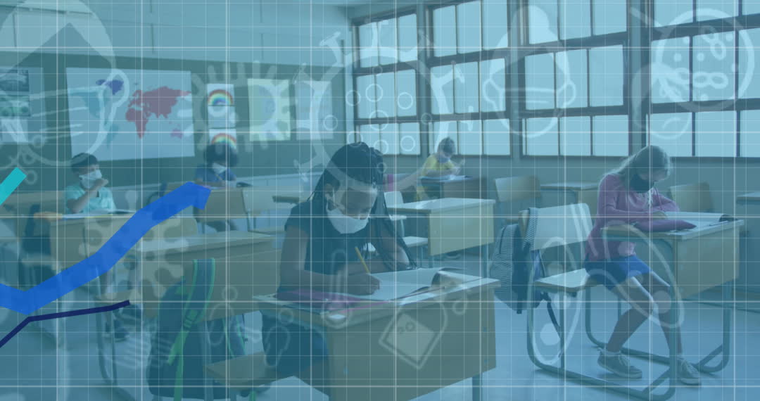 Multiple children sitting in a classroom, all wearing face masks while working at their desks, is emphasized by the animation of data processing symbols and blue lines over the scene. This visual effectively portrays the impact of the COVID-19 pandemic on education, illustrating efforts to maintain learning amid safety measures. Useful for articles and materials focused on the adaptation of schools during the global pandemic, virtual learning expansion, or educational statistics and data analysis related to COVID-19.