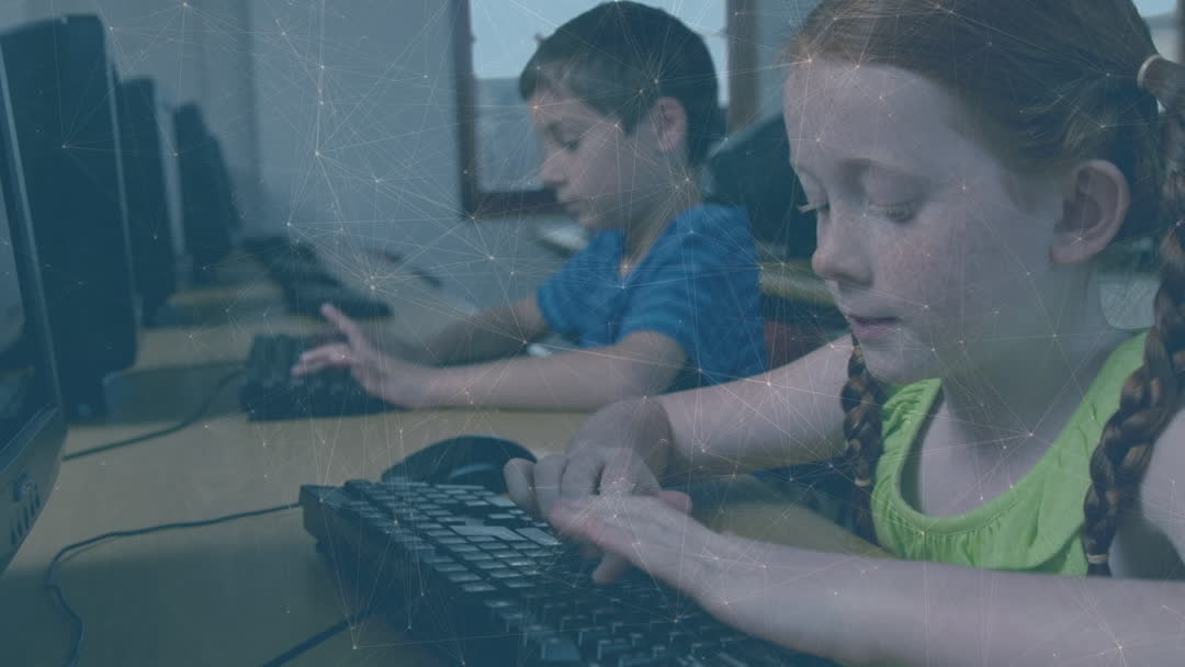 Children sit in a classroom using computers, visualized with a digital network graphic overlay. This concept represents global education, technology in schools, and the importance of digital skills for young students. Ideal for use in education blogs, technology reports, or any media focusing on the integration of tech in learning environments.
