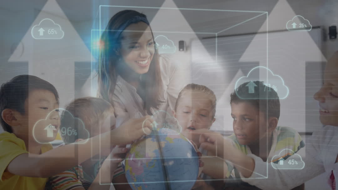 Diverse group of children gather around a globe with a teacher, illustrating modern education through a digital interface overlay. Iconic cloud and statistic graphics convey themes of data usage and global connectivity in learning environments. Ideal for showcasing educational technology, promoting inclusive classroom settings, or highlighting global competence in media related to schools and education initiatives.