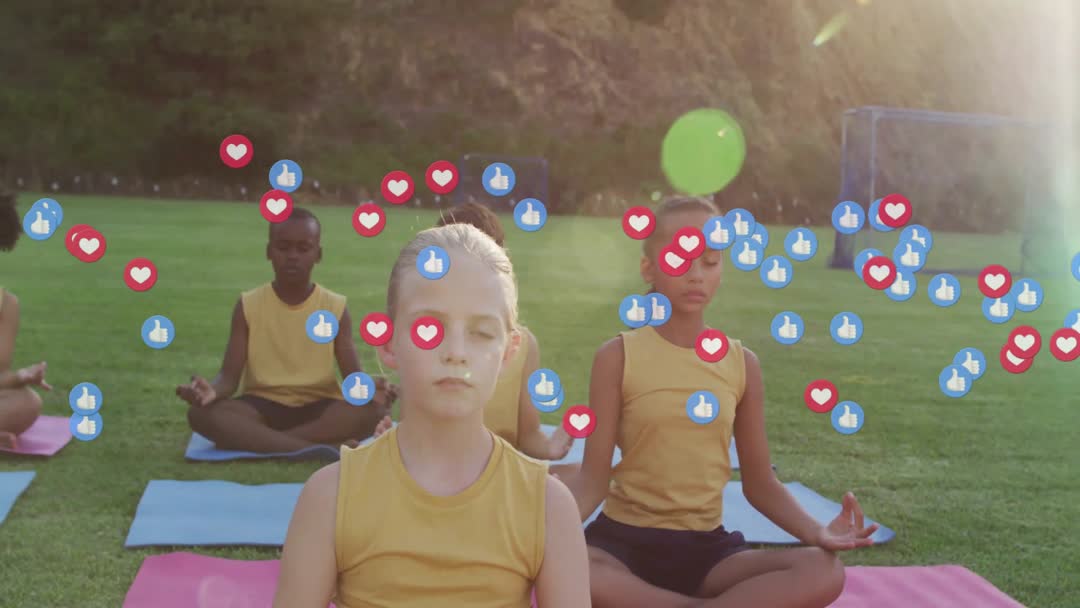 Children meditating on a green field with social media icons floating around creates a unique blend of technology and mindfulness. The video portrays themes of focused relaxation and digital interaction, ideal for discussions about youth engagement in meditation, positive use of technology, or modern wellness practices promoting mental health among children.