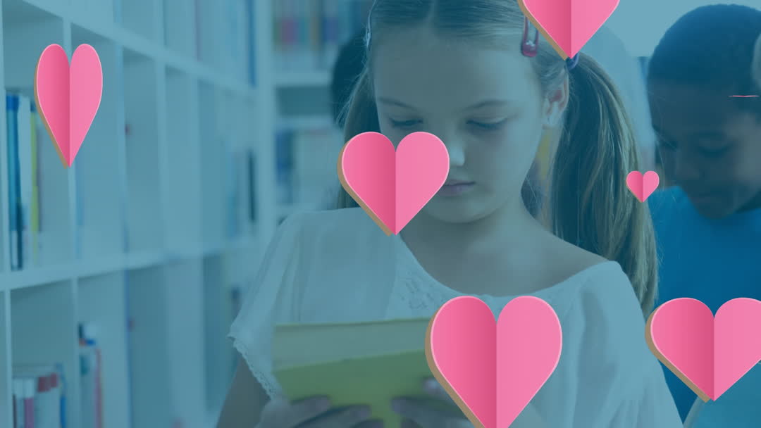 Children are engaging in reading at a library. The hearts overlay adds a playful and loving aspect, suggesting themes of empathy and passion for learning. Kept for children's education materials, school brochures, or library programs, this video perfect portrays concepts of diverse learning environments with love placed ono knowledge acquisition and child development.
