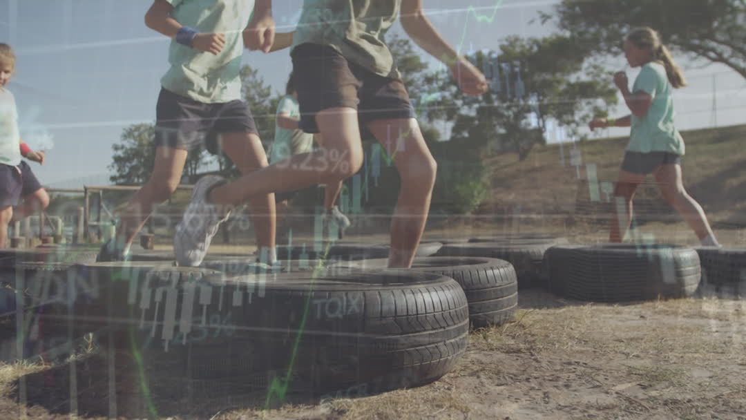 Children are engaging in an outdoor exercise by running through tires as part of an obstacle course. Overlaid are some graphical financial metrics and stock market data, illustrating a concept of economics, future, and growth. This could be used in articles about investment in youth, combining physical fitness and education, or the impact of global finance on development initiatives.