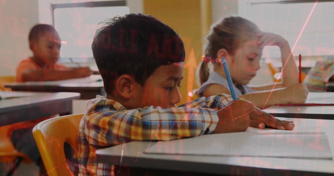 This video depicts children focusing on writing tasks at their school desks with a translucent red graph overlay. The visual representation symbolizes the integration of technology and data analysis in modern education. Ideal for use in educational articles, blog posts centered on learning trends, infusions of technology in schools, or illustrative purposes in presentations focused on modern classroom environments.