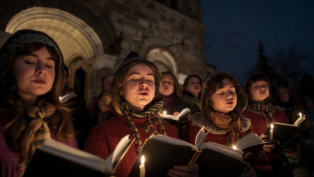 AI Generated Video. Children dressed in winter coats gather at a church’s portal, singing hymns and holding lit candles and hymnals. This atmospheric scene reflects traditional and festive aspects, making it suitable for promoting Christmas concerts, community events, or illustrating articles about holiday traditions and gatherings.