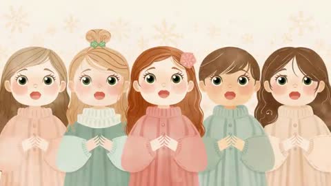 AI Generated Video. Frame from animated video showing five young girls singing winter carols, hands clasped, mouths opening in soft harmony. Characters wearing cozy pastel sweaters, set against soft snowflake backdrop with warm beige tones and gentle sparkle. Illustration capturing childhood innocence, festive warmth, group unity, and vocal harmony. Ideal usage including holiday greeting videos, seasonal social media posts, children choir promotions, school concert announcements, festive website banners, family newsletter headers. Editing suggestions: add text overlay for title or call-to-action, loop segments for background ambiance, pair with soft choral soundtrack, extract stills for print greeting cards or posters. Target audiences including music educators, event planners, retailers, content creators, greeting card designers.