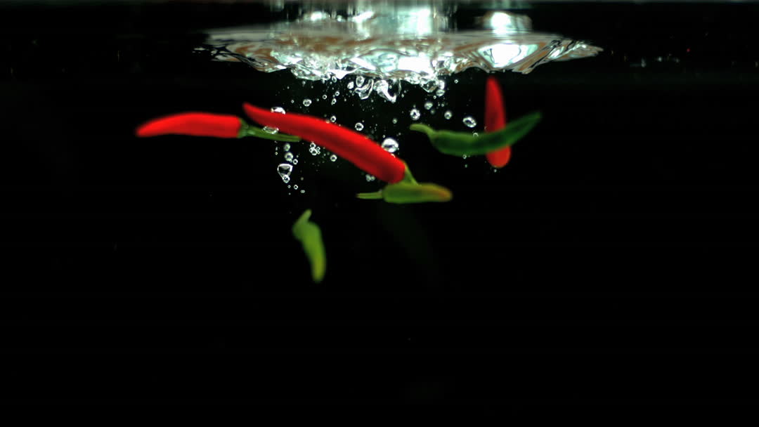- Chilies Falling into Water in Dramatic Slow Motion Shot