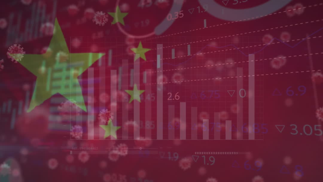 Animation depicts China's flag with an overlay of financial data and coronavirus cells, symbolizing economic impact amidst the pandemic. Useful for illustrating economic analysis, global business impacts, and coronavirus effects on national and international markets.