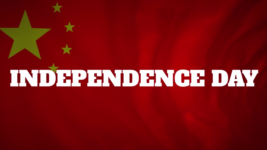 Vivid red Chinese flag with gold stars serves as background for bold 'Independence Day' text. Suitable for use in articles or campaigns related to national holidays, celebrations, and patriotic events in China. Great for educational or informative content about Chinese national pride and independence celebrations.