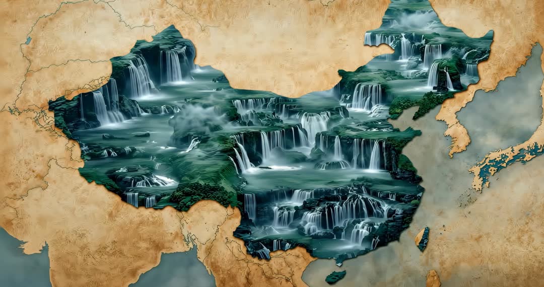 China's Parchment Map Unveiling Cascading Waterfalls Video