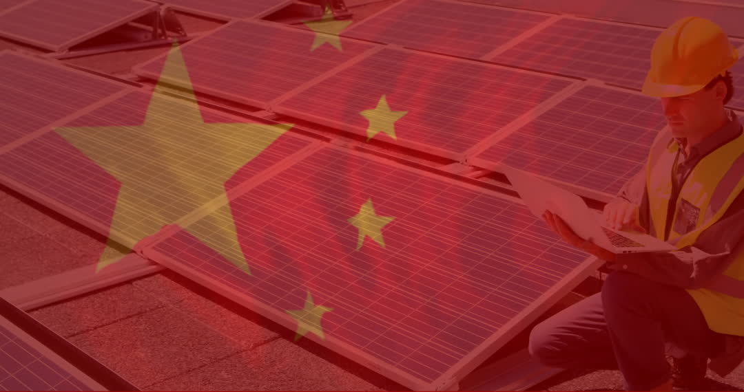 Image features a noun inspecting solar panels, representing China's advancements in renewable energy sectors. Solar panels highlight sustainable efforts in energy production. Red Chinese flag symbolizes patriotism and national commitment to green initiatives. Useful for content on China's renewable energy developments, worldwide market influence in sustainable industries, or illustrating technical roles in energy production landscapes.