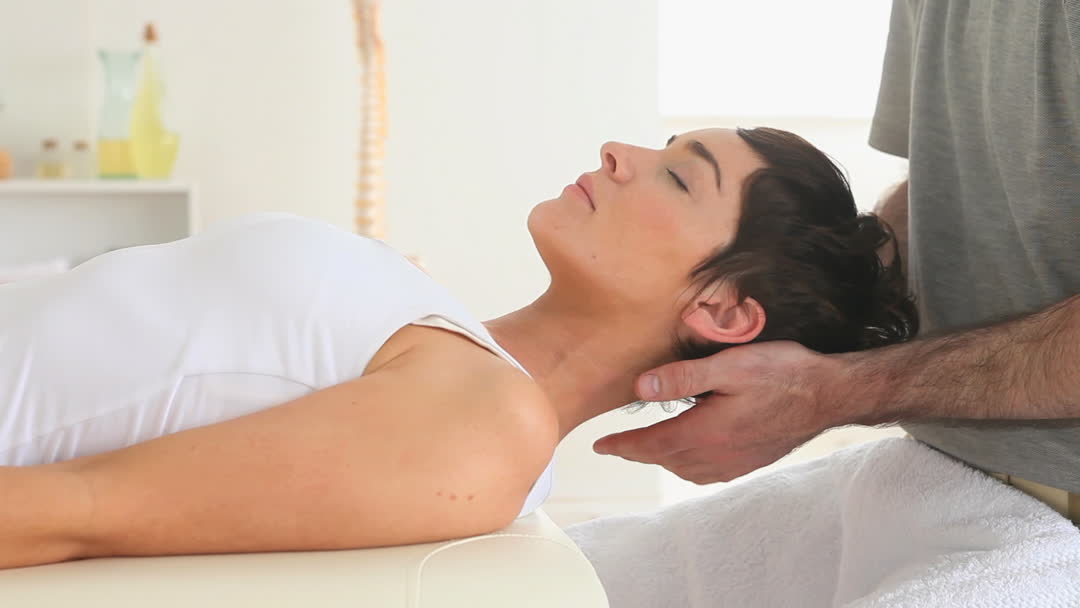 Woman experiencing chiropractic care with focus on neck adjustment. Perfect for use in articles about healthcare, wellness therapies, or promoting chiropractic or massage services.