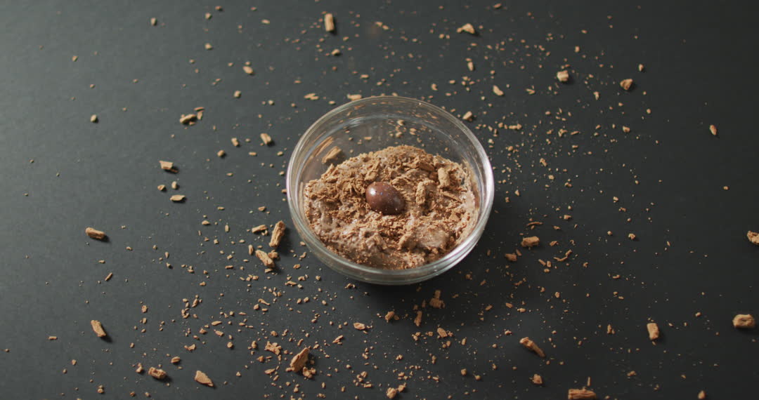 This delicious video shows a bowl of chocolate pudding, topped with a chocolate egg, set on a black background. The detailed decor of chocolate shavings enhances its gourmet appeal. Perfect for use in culinary websites, chocolate dessert promotions, or party planning materials.