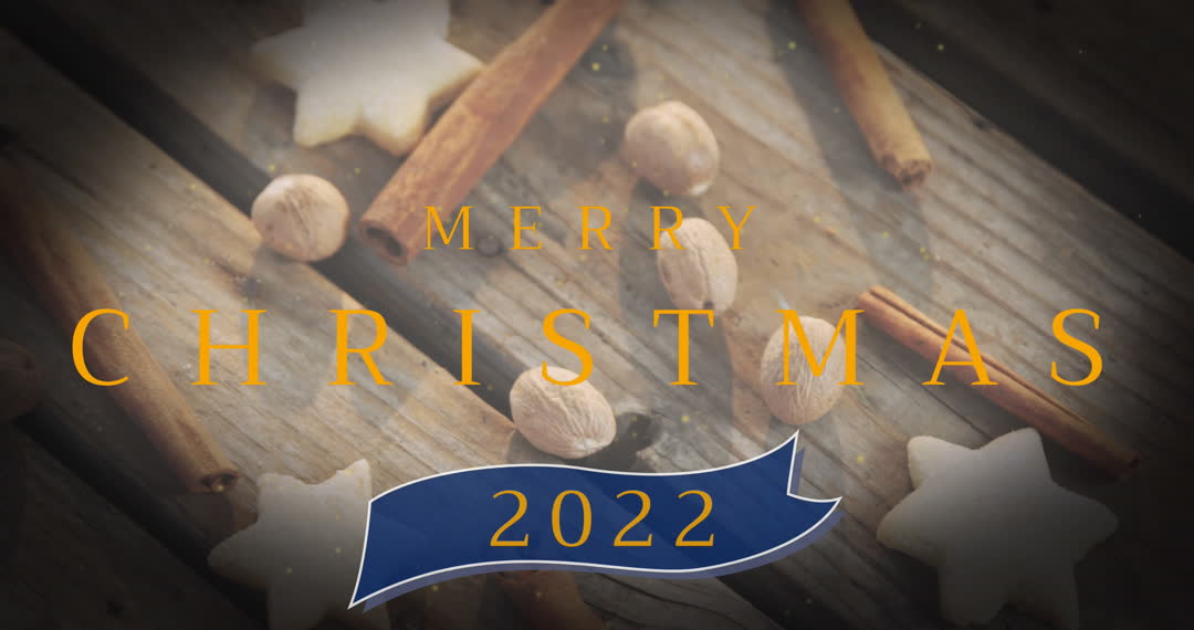 Scenes features a festive Christmas greeting for the year 2022, styled with rustic elements like cinnamon sticks, nutmeg, and star-shaped cookies laid on a wooden surface. Great for holiday-themed campaigns, season's greetings cards, websites featuring holiday content, or as part of festive social media posts.