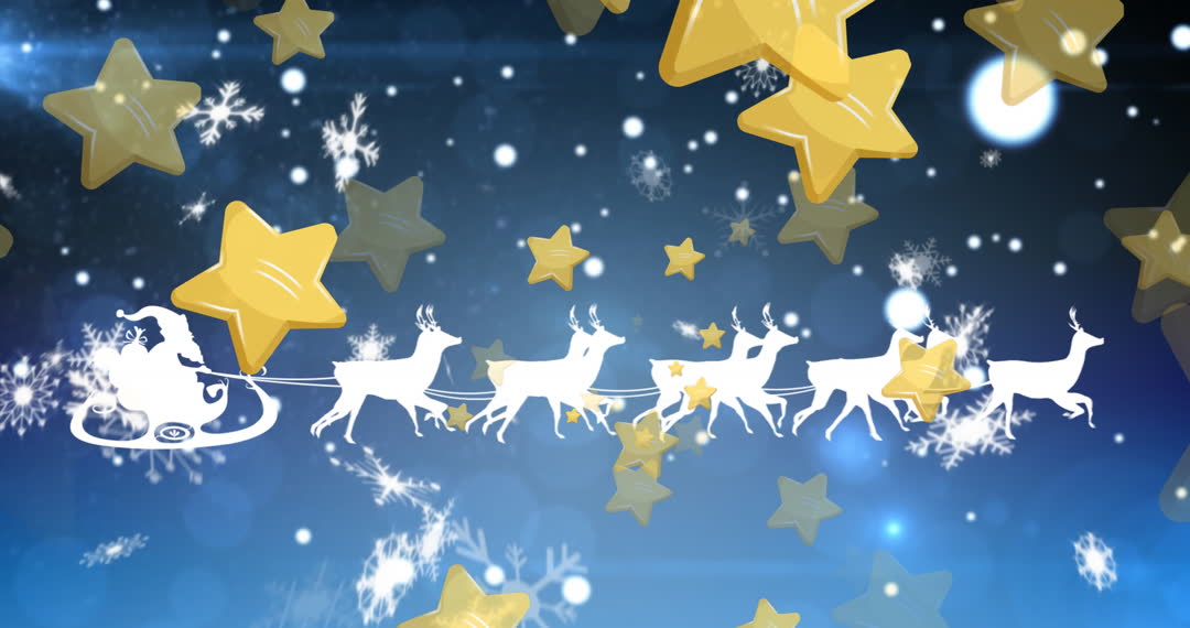 This Christmas-themed animation features a silhouette of Santa's sleigh pulled by reindeer gliding through a wintery midnight sky swirling with golden and silver star motifs. The background includes ornate snowflakes, adding a playful and magical feel to the scene. This visual is perfect for holiday advertisements, festive greeting cards, Christmas-themed videos, and as endearing background visuals for holiday parties or events.