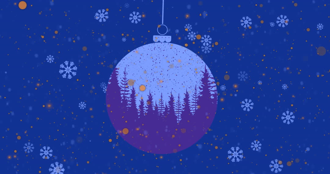 Christmas-themed animation featuring a hanging bauble decorated with a winter landscape amid falling snowflakes and orange spots. Perfect for festive digital greetings, holiday presentations, or seasonal website designs.