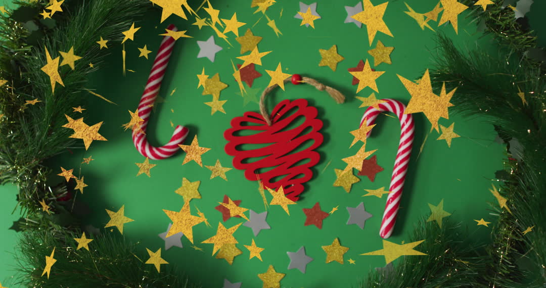 Bright and cheerful holiday scene features candy canes, stars, and a red ornament against a green background, evoking festive spirit. Perfect for Christmas greeting cards, digital invitations, or holiday-themed presentations to convey warmth and joy.