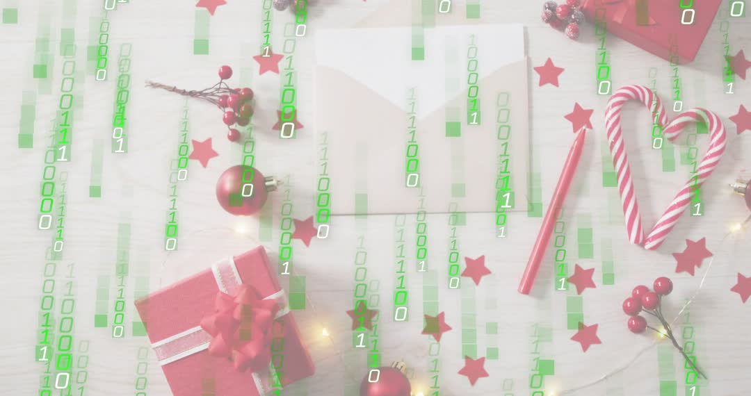 The scene artfully fuses festive Christmas elements such as red and white ornaments, gift boxes, a candy cane and natural decor with layers of binary code cascading over the frame, adding a futuristic digital twist. Perfect for digital holiday cards, creative computer-themed celebrations or a holiday marketing campaign.
