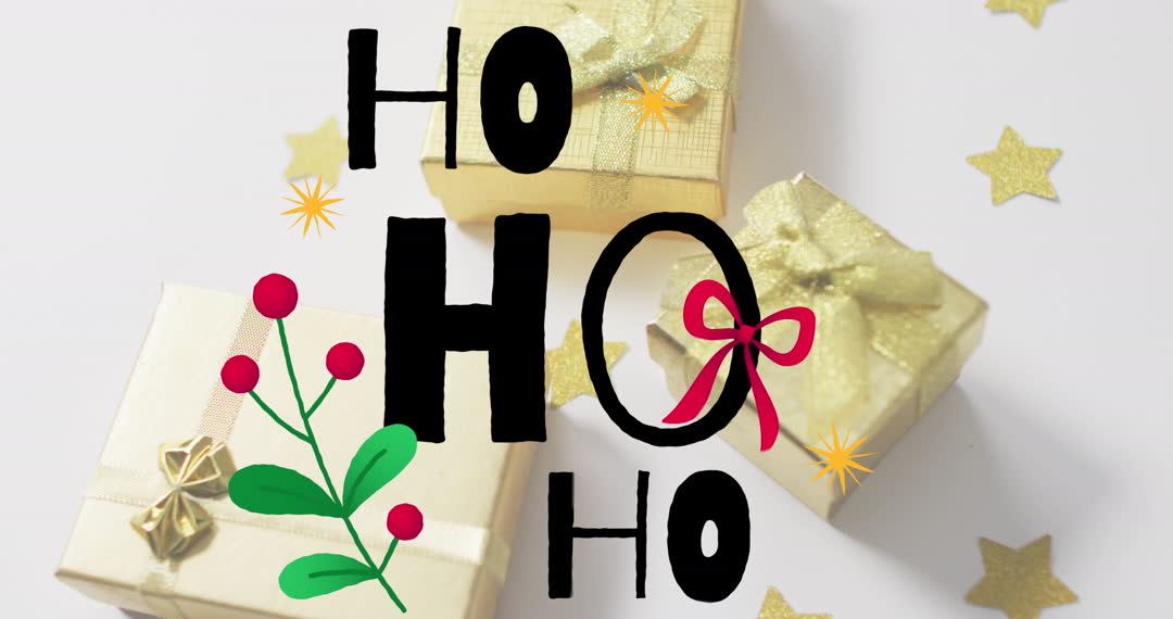 Gold wrapped presents with decorative ribbons arranged on a white surface alongside scattered golden stars. Hand-drawn 'Ho Ho Ho' text with festive icons enhances holiday cheer. Perfect for Christmas promotions, holiday cards, seasonal marketing, and festive retail displays.