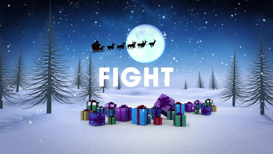 Scene depicts festive winter night with text 'FIGHT' over gifts against snowy background. Santa's sleigh flying in front of bright moon adds charm. Perfect for creative holiday visual effects, Christmas themed graphics, festive social media post, or playful marketing campaign centered around holiday themes.