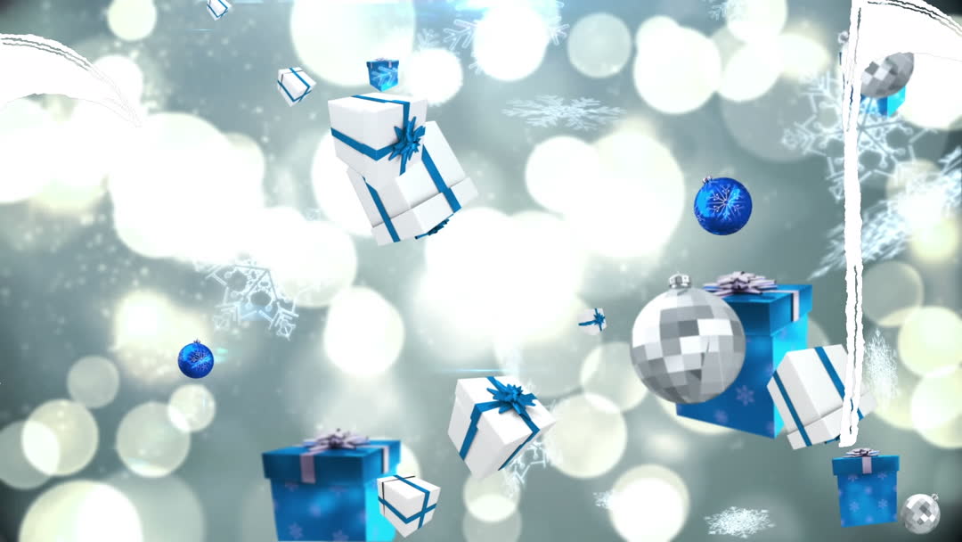 This animated video features blue and white gift boxes floating against a shimmering snowy background with bright Christmas ornaments. Snowflake patterns highlight holiday cheer and celebration. Ideal for festive marketing campaigns, holiday-themed presentations, or Christmas greeting cards, this artwork brings the joy of the holiday season.