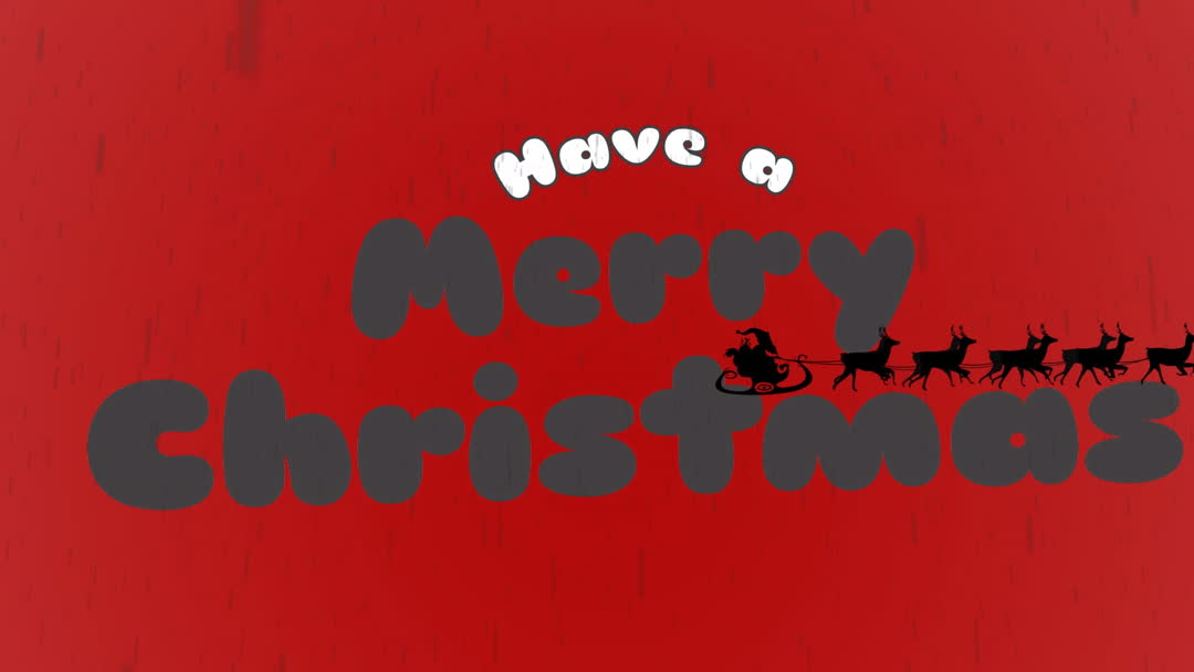 Red background with animated Santa in sleigh pulled by reindeers above Merry Christmas text. Ideal for seasonal greeting cards, festive banners, or digital holiday invitations.