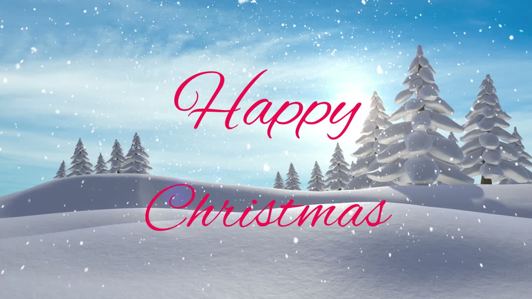 Winter scene with snow-covered hills and pine trees plus festive 'Happy Christmas' message. Perfect for digital holiday cards, seasonal greetings, festive décor, or social media posts celebrating Christmas.