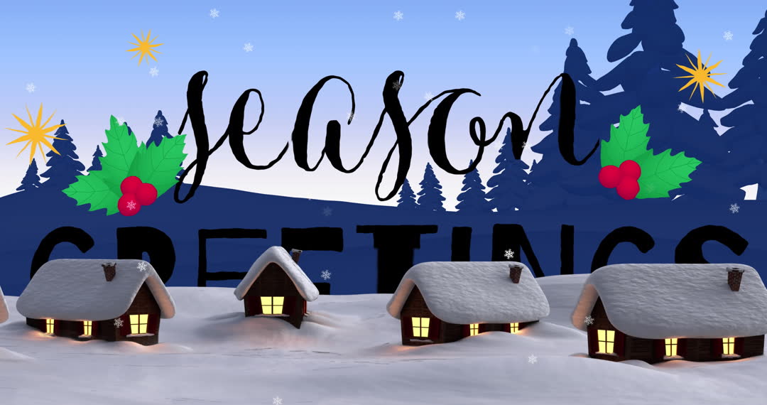 This festive winter scene features animated text 'season greetings' evoking the spirit of Christmas and holiday celebrations. Snow-covered houses with warmly lit windows set against a forest backdrop evoke cozy, cheerful feelings. Perfect else for Christmas greeting cards or for decorating digital posts aimed at celebrating the joyful season. Ideally suited for businesses and personal uses on social media, websites, or email marketing to convey warmth and cheer during the festive period.