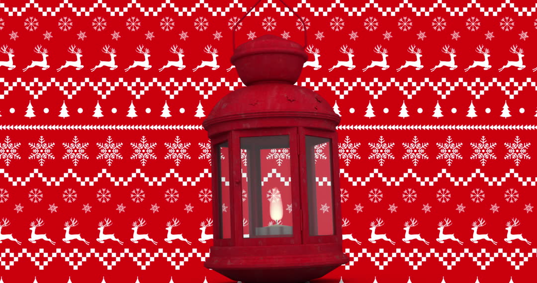 Elegant red lantern illuminated against a festive holiday-patterned background featuring reindeer, snowflakes, and trees. Perfect for websites, holiday greeting cards, promotional materials, or digital media featuring classic Christmas themes.